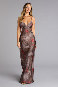 Adaline Floral Satin Open Back Formal Dress Adaline Floral Satin Open Back Formal DressSpecial Occasion Slip into effortless allure with the Adaline satin floral gown, designed with a sleek open back and delicate tie detail. Its fluid silhouette and romantic print make it the perfect mix of elegance and ease for unforgettable evenings. Fit & Features - Floral print, premium satin fabric, woven lining