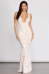 Ada Formal Sequin Feather Midi Dress Ada Formal Sequin Feather Midi DressSpecial Occasion Homecoming dresses like the Ada formal sequin midi dress will make you stand out from the crowd! She features a plunge V-neckline with a wire insert, a V-cut back, a padded bust, gorgeous feather trim shoulder straps, a bodycon silhouette, and a flattering front slit along her knee-length hem. The mid-length dress is composed of a shimmering sequin pattern on mesh fabric that brings radiance to your evening and has a stretchy knit lining. Complete the look for HOCO or a gala in this formal midi dress with block heels and a clutch. Fit & Features - Sleeveless plunge V-neckline, wire insert