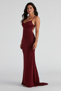 Adah Formal Glitter A-Line Dress Adah Formal Glitter A-Line DressSpecial Occasion Razzle and dazzle in the Adah formal glitter dress sure to memorize the room with her sparkly entrance! She features a sleeveless, sweetheart neck, lightly padded bust, and sleek bungee spaghetti straps that cross along her open back with a bum-ruched seam and zipper closure. Her form-fitting, a-line silhouette accentuates your curves and elongates your figure thanks to the flared, floor-length hem. The formal dress is composed of a glitter stretch-knit lined fabric. Complete your dressy look with a chic hairpiece to tame your tresses. Fit & Features - Sleeveless, sweetheart neck, bungee spaghetti straps