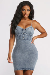 Acid Wash Denim Spaghetti Strap Button Mini Dress Acid Wash Denim Spaghetti Strap Button Mini DressGet drawn to denim dresses this season. Slip into this curve-hugging dress for your next night out with bae. Fitted with a sleeveless sweetheart neckline, adjustable spaghetti straps to avoid wardrobe malfunctions, and corset-like seams that accentuate curves. The real details can be found in the multi-button down accent at the bodice that leads to a mini length silhouette. The light-medium acid wash denim fabric offers a form hugging fit. Complete your look with fab pumps and dainty accessories. Fit & Features - Sleeveless sweetheart neckline