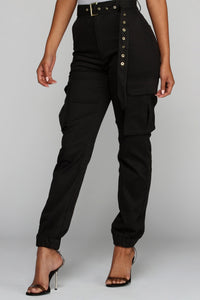 Make a trendy statement in these boldly belted cargo joggers! They feature a high rise waist, a front button and hidden zipper closure, an included belt with buckle detailing, front and back pockets, cargo style pockets, and a tapered, jogger hem. The pants are composed of a woven fabric with minimal stretch.