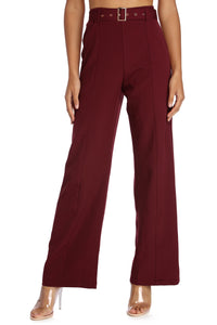 You'll look stunning and bold in these chic belted wide leg pants! They feature a high rise fit, a belted waist with a gold hued buckle and grommets, seam detailing, a hidden side zipper and hook and eye closure, and flowy, wide pant legs. The bottoms are composed of a smooth woven fabric that offers minimal stretch.