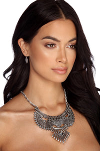 Make a bold statement at the next festival with this silver metal boho necklace and earrings set! It features a winged bib design with a lobster clasp closure, and matching tear drop earrings with a hook.