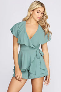 Add some fun flair to your look with this adorable romper! It features short fluttery sleeves, a plunging wrap front V neckline with a ruffle trim, an open back with a ruffle overlay, a high waist seam with a tie front, a ruffle wrap overlay, a hidden zipper and hook and eye closure, and fitted shorts. The romper is composed of a lightweight woven fabric with no stretch.Style Number/Barcode: 06403-0046
