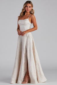 Create an enchanting homecoming or prom look that radiates elegance and grace in our Adalyn brocade dress! She features a classic scoop neckline, padded cups, spaghetti straps that lead to a cross-back lattice design, a high waist seam, and a flowy, floor-length, A-line silhouette with a high slit. The dress is composed of a lined textured woven knit fabric with a minimal stretch. Her brocade print elevates and pairs beautifully with gleaming rhinestone jewelry and sleek stilettos.