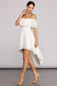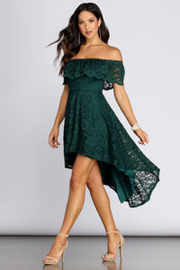 Add some flair to your style with this adorable lace skater dress! It features an off the shoulder neckline with a sheer lace overlay, a high waist seam, and a flowy skater skirt with a high low hem. The dress is composed of a sheer lace fabric with a full knit lining and has moderate stretch.