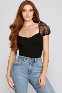 Add some flair to your everyday look with this chic bodysuit! It features short puff sleeves made of sheer organza fabric, a sweetheart neckline, a flattering seam under the bust, and a fitted bodice. Complete the outfit with high-rise denim and hoop earrings.