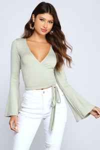 Add some flair to your casual everyday look with this stylish knit top! It features long flared bell sleeves, a wrap-front design creating a V-neckline, a tie-front accent at the waist, and a relaxed fit. Complete the outfit with your fave pair of denim.
