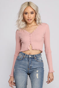 Add a trendy flair to your style with this adorable cropped cardigan! It features long fitted sleeves, a V neckline, a button-down front, ruffle detailing along the hems, and a form-hugging fit. Pair this ribbed knit cardigan with mom jeans and chunky sneaks to go hang with your squad.