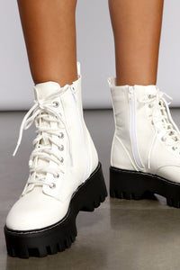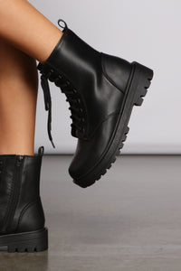 Add some edge to your everyday look with these cool faux leather combat booties! They feature an above the ankle design with a lace-up front, inner zipper closure, and trendy lug sole. Pair these booties with faux leather leggings to amp up your style!