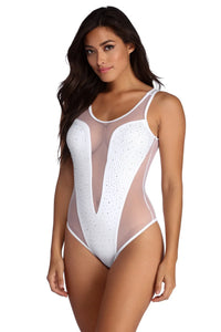Look white hot in this one piece swimsuit that features a sheer mesh fabric with a strategically placed V shaped lining adorned with heat stones. Also features a scoop back and a cheeky bum. Includes removable padded cups.Model is 5'7" with a 34" bust, 24" waist and 36" hips. She is wearing a size small.