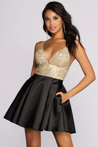 Special OccasionCheers my dears! This party dress is all the rave ! She features a beautiful metallic lace detailed bodice, a v-neckline, and adjustable spaghetti straps that tie in the back, her spaghetti straps meet in the back to a square back with a zipper. She has an inner lining, as well as padded cups and her skirt meets at the waist with a pleated style and of course, pockets! So beautiful babe!