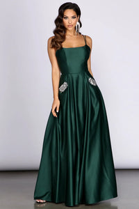 Drama and elegance come to mind as you step out in our stunning Adela. Her voluminous ball gown will put you into focus. But the true magnets of attention are the glistening rhinestone trim at her slant hand pockets. Look and feel like absolute royalty by pairing Adela up with cascading rhinestone earrings and a sparkling cuff.