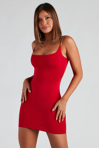 This fiery bodycon mini dress will add some spice to your night-out look! It features a sleeveless square neckline, trendy chain-link shoulder straps, and a short, curve-hugging silhouette. The smooth knit fabric offers plenty of stretch. Style this sexy mini dress with platform heels.