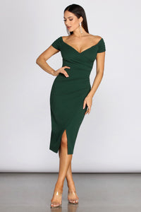 Stunningly timeless, Addison brings an elegant aura to your special moments! She features an off the shoulder neckline, a wrapped sweetheart bust, off the shoulder cap sleeves with ruched detailing and a midi length silhouette with an asymmetrical hem. Dress is composed of a lined crepe fabric that offers a curve hugging fit with a moderate stretch.