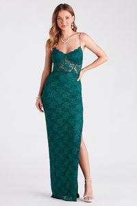 Light up the room in the lovely Adelaide formal dress showcasing sparkling glitter to enchant at banquets or galas! She features a sleeveless scalloped V-neckline, sleek bungee spaghetti straps, a sheer bodice with satin trim, and a hip-hugging slim silhouette with a sultry side slit and long hem. The formal long dress is composed of a glitter lace fabric with a stretchy knit lining. Complete the look with a clutch and platform heels.