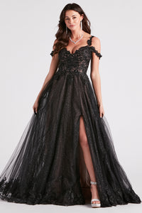 Glitter works its magic on the breathtaking Adele ball gown - a stunning option for prom, black tie galas, and formal celebrations! She features a lovely cold shoulder sweetheart neckline with delicate lace straps, a padded bust, an enchanting lace glitter bodice that leads to the A-line silhouette, and a sultry high front slit along her scallop lace floor-length hem. The ball gown is designed with a glitter lace mesh overlay with a smooth satin lining and no stretch. Complete the look with a gorgeous hair accessory and heels.