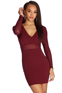 Add a little mesh to your look with this sultry mini dress! It features a deep V neckline, a square back with an exposed gold zipper and hook and eye closure, long sheer fitted mesh sleeves, seam detailing, a sheer mesh waist insert, and a short, form hugging fit. The burgundy dress is composed of a mesh and crepe fabric that offers moderate stretch.