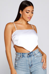 Add some sparkle to your look with this trendy satin scarf top! It features a sleeveless square neckline, thin rhinestone straps, an open back with a tie closure, and a cropped, V-shaped front hem. Style this top with high-rise mom jeans and clear heels.