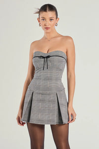 Adorable Factor Plaid Strapless Drop Waist Romper Adorable Factor Plaid Strapless Drop Waist RomperLevel up your style with this plaid strapless drop waist romper. Featuring a sweetheart neckline, bow trim, and pleated overlay, it's your go-to for flirty vibes and fun times! Fit & Features - Plaid knit fabric