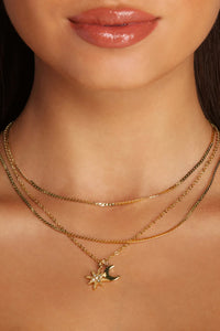 Layer on this pretty charm necklace for a trendy chic vibe! It features three rows, the two shorter layers featuring snake chains, and the longest layer showcasing a moon and star charm with cubic zirconia details. Includes an adjustable lobster clasp closure.