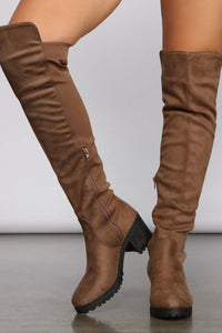 Slay in chic boots that command attention! The boots feature an over the knee fit, a 50/50 nylon and faux suede composition, an almond toe, lug sole, and a low block heel. Complete look with a cardigan and skinny jeans.