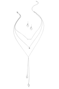 Layer up the finishing touches with this must have silver necklace. It features 3 rows of dainty chains with a bar, coin and arrowhead charms, and a lariat design. Closes with a lobster clasp.