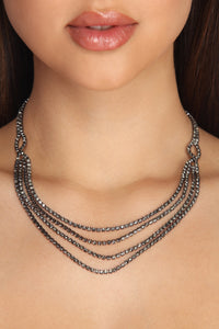 A sparkling necklace is a must have when dressing up! This beautiful dark gray necklace features four rows of rhinestones that come together to for an elegant layered look. Closes with a single lobster clasp closure.