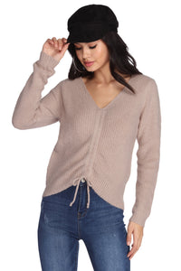 You'll be all about this cute fuzzy knit sweater! It features a V neckline, long sleeves, and a front drawstring to cinch and scrunch. The pink sweater is composed of a soft ribbed knit fabric that offers plenty of stretch and a relaxed and comfortable fit.