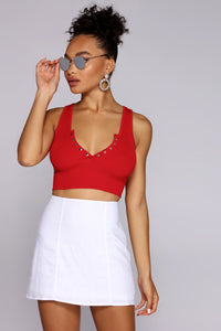 You'll be all about this cute knit crop top! It features a sleeveless bodice, tank shoulder straps, a deep V neckline, a snap button front, and a cropped hem. The red top is composed of a stretchy ribbed sweater knit fabric that offers a form hugging fit.Model is 5'9" with a 34" bust, 24" waist and 34.5" hips. She is wearing a size small.