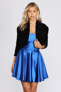 Bring the luxe to your evening looks with a glam cover up! This must have piece features an open front, quarter-length sleeves with ruched detailing and an all over velvet fabric.