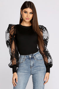 Have a major chic moment in this sheer floral sleeve top! Pair with some faux leather pants and stilettos for that instant fashionista look!