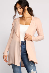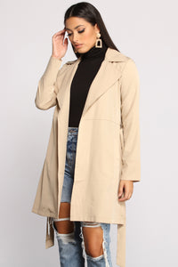 Get a classic and chic vibe in this flowy belted trench! It features a lightweight crepe fabric with a drape front and a tie front belt to cinch the waist. Pair this trench with a basic bodysuit and destructed denim for an overall gorgeous look.