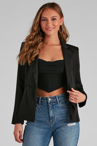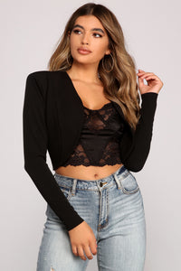 Layer on this trendy cropped blazer for a major chic moment! It features shoulder pads, long fitted sleeves, an open front, and a cropped, tapered fit. Style this blazer over a bodysuit and high waist denim to elevate a casual outfit.