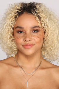 Have a major chic moment when you accessorize with this pretty necklace! It features a layered design for a gorgeous look. The shorter layer features a thicker chain choker design and the longer layer has a dainty chain with a center cross charm. Complete the outfit with stud earrings.