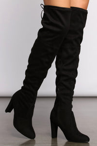 Get such a chic vibe in these trendy over the knee boots! They feature a sturdy block heel and a cute tie back detail. Pair these faux suede boots with a flirty mini skirt to elongate your legs.