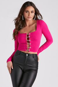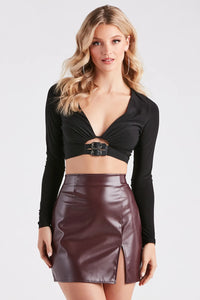 Accessories are a girl's best friend and this crop top delivers! It features fitted long sleeves, a plunge V-neckline, a cutout accent, and dual faux leather buckle trims along the fitted hem on slinky knit fabric. Complete the look in best-selling high-waisted bottoms for a cute fit!