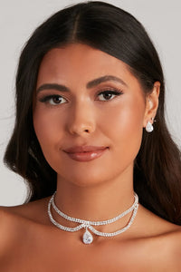 Bring the bling and showcase a luxe glamorous vibe with this embellished jewelry set. It features a choker necklace with mini rhinestones in a draped design and a center large teardrop-shaped cubic zirconia stone with a rhinestone halo trim. The set also includes a matching pair of teardrop-shaped cubic zirconia stud earrings. Style this set with a strapless formal dress and a sleek clutch.