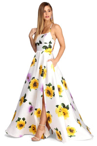 Special OccasionWrap yourself in captivating florals to create a naturally gorgeous look! Amber features a sleeveless bodice, a scoop neckline, padded cups and adjustable straps that lead to a lattice back. Her slim fit bodice leads to floor length wrap skirt accented with hidden side pockets and a high side slit. She is composed of a lined ivory textured satin fabric adorned with a yellow and purple hued floral print. Dress offers a form hugging fit with minimal stretch.