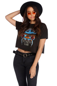 Channel those edgy vibes in a crop top that will have you ready for festival season! The top features a crew neckline, short sleeves, an image of a motorcycle with wings, a graphic that reads: "American Motorcycle Legend", slashed detailing, and a cropped hem. Complete look with denim shorts and booties.