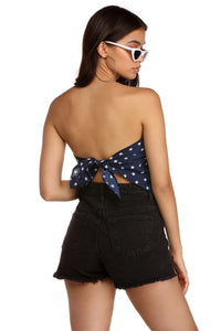 Showcase your patriotic side with a bikini top that is perf for Memorial Day or Fourth of July festivities! It features a classic triangle design with halter spaghetti straps, tie-back straps, and an Americana stars and stripes pattern in red, white, and blue. Complete your look with the matching bikini bottoms.