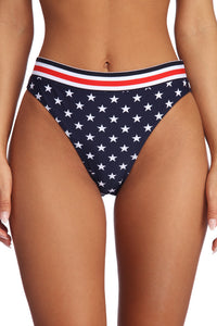 Sport some stars and stripes to show off a patriotic look! These swim bottoms feature a high rise waist with a red, white, and navy blue striped elastic band and a cheeky bottom. The navy blue bottoms showcase a star print. Complete your Americana look with the matching swim top!Model is 5'6" with a 34" bust, 24" waist and 37" hips. She is wearing a size small.