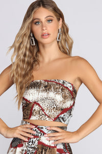Heed the call of your inner wild child with this daring tie-front top! It features a vibrant mix of reptile and cat prints intercut with bursts of deep red and comes in one long, bandeau scarf style with angled ends. Top is made from a smooth, chiffon-like material with minimal stretch.Style Number/Barcode: 06003-0304