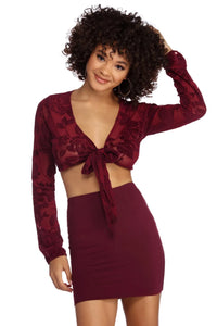 Anything goes with this pretty rose detailed tie front top! The piece features long sleeves with elastic cuffs, a chic tie front, and a cropped hem. The top is composed of a burgundy hued sheer mesh fabric with a velvet rose detail print.