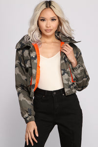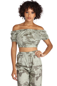 Stand at ease in this military inspired crop top! It features an all over olive hue, an elastic off the shoulder neckline with adjustable drawstrings, short sleeves and an elastic cropped hemline. The all over camo print features an olive green hue. Top is composed of a lightweight woven fabric that offers a relaxed fit with slight stretch. Be sure to pick up the matching pants to complete your look!