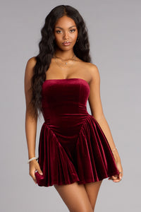 This strapless velvet mini dress brings the perfect balance of glam and play with its sculpted bodice and drop-waist skater silhouette. Soft, bold, and made for dancing at holiday soirees or dressy events!