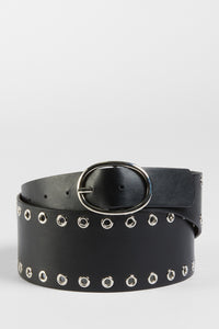 Elevate your casual looks with this edgy faux leather belt featuring a studded trim design for that cool-girl vibe.