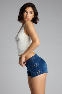 These mid-rise denim shorts serve attitude with buckle side straps that flirt hard. Pair with a crop top and watch heads turn at concerts, carnivals, and summer nights out!