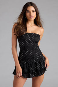 Classic and cute, this polka dot knit romper will be a summertime staple. Designed with a strapless neckline, drop waist, and tiered ruffled overlay, pair with strappy mules.