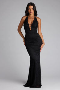 Set to stun at any formal soiree, the Lane lace formal dress captivates every eye with its beauty! This dress boasts a sultry halter plunge neckline atop a curve-hugging mermaid silhouette, while the low strappy back turns heads.